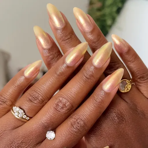Простой маникюр — это не обязательно про минимализм. Сияющий нейтральный золотой оттенок здесь выглядит почти невесомо, привлекает внимание и при этом легко сочетается с любым образом. Благо существует множество лечебных лаков с блестками!