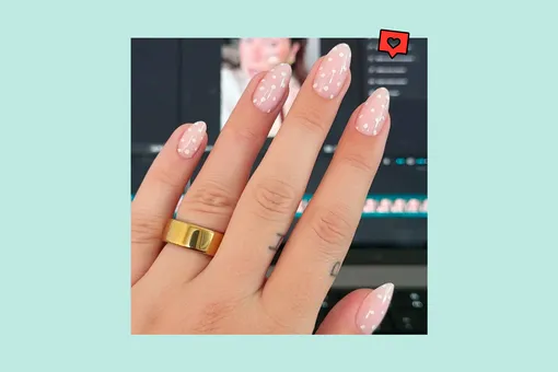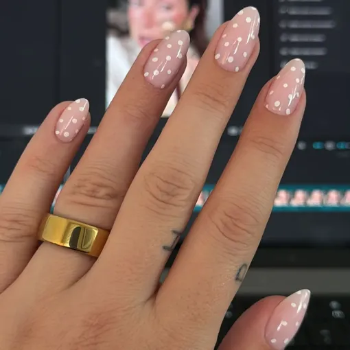 «Голый» маникюр в горошек тонко балансирует между минималистичностью и актуальной классикой. Белые точки выглядят максимально деликатно, но на нейтральной базе можно попробовать любой оттенок.
