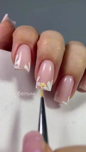 - Окуни тонкую кисть в белый лак и нарисуй на уголках каждого ногтя несколько крупных лепестков.