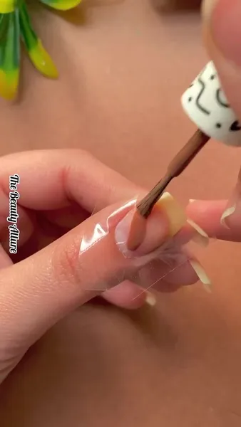 - Отрежь 2 небольшие полоски скотча и наклей их на ноготь так, как показано на видео.