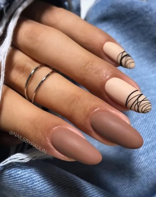В ближайшие месяцы предлагаем сосредоточиться на традиционно осенней палитре лаков: бежевый, коричневый, черный, сливовый, бордовый или пыльная роза. Эти цвета послужат отличной основой для простого, но в то же время эффектного дизайна-паутинки. Вот несколько вариантов, которые точно будут в тренде!