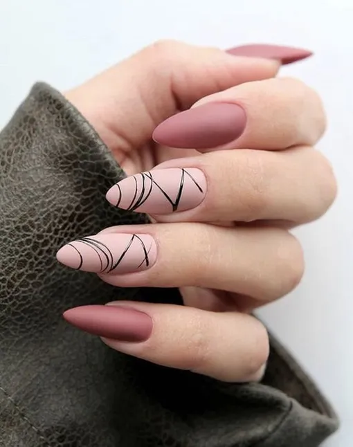 Маникюр в пастельно-розовых тонах не будет выглядеть слишком наивно, если украсить несколько ногтей сплетением тонких черных нитей.