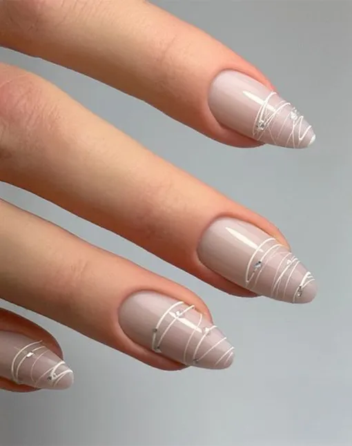 Тонкая белая путинка, уложенная поверх нейтральной нюдовой основы, будет смотреться очень нежно и женствено. Можно дополнительно усыпать нити мелкими стразами, — так они напомнят сверкающую гирлянду.