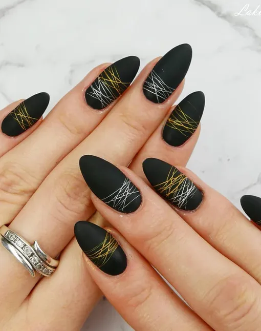 Гель-паутинка будет особенно интересно смотреться в золотом и серебристом цветах. Лучшей подложкой для такого украшения станет черное матовое покрытие, которое будет выгодно оттенять блеск элементов.