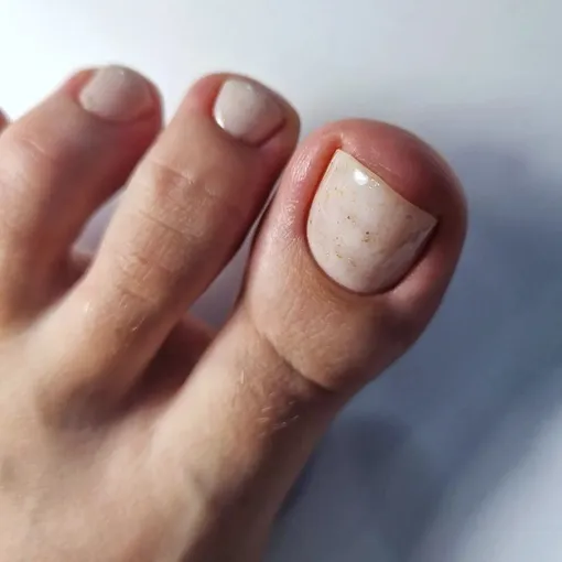 С небрежностью можно столкнуться, делая и «богатый» педикюр с золотом и блестками. Если в лаке содержатся довольно крупные частицы шиммера, но покрытие наносится не плотно, со стороны ногти могут показаться не блестящими, а грязными.
