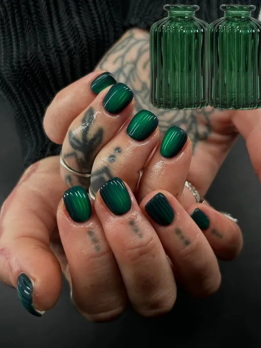 «Стеклянные» ногти сейчас на пике, а в зеленом исполнении они выглядят просто волшебно. Рифленый дизайн напоминает старинные стеклянные флаконы, что выглядит винтажно и роскошно.