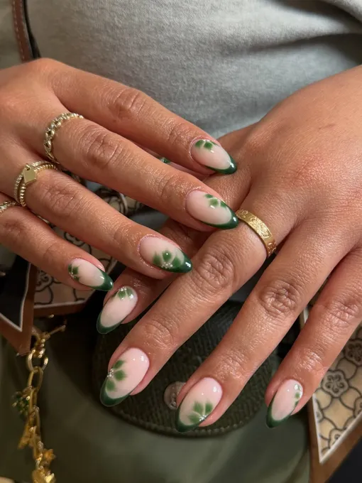 Не готова полностью погружаться в зеленый? Попробуй френч в оттенке темного леса. А добавив изящные листочки на каждый ноготь, сделаешь дизайн еще интереснее.