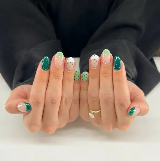 Любишь неожиданные решения? Попробуй разноцветный горошек: три оттенка зеленого, белый френч и никакой скуки.