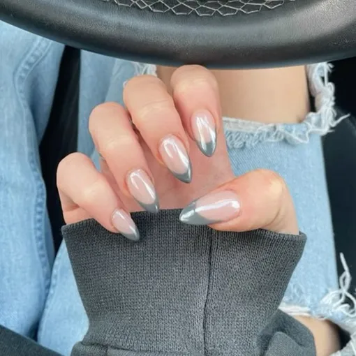 Если ты обожаешь френч, и делаешь его при всяком удобном случае, то можешь попробовать френч с глянцевым покрытием и тем самым серым цветом на кончиках. Отлично подойдет как к однотонному худи, так и к платьям нейтральных цветов.