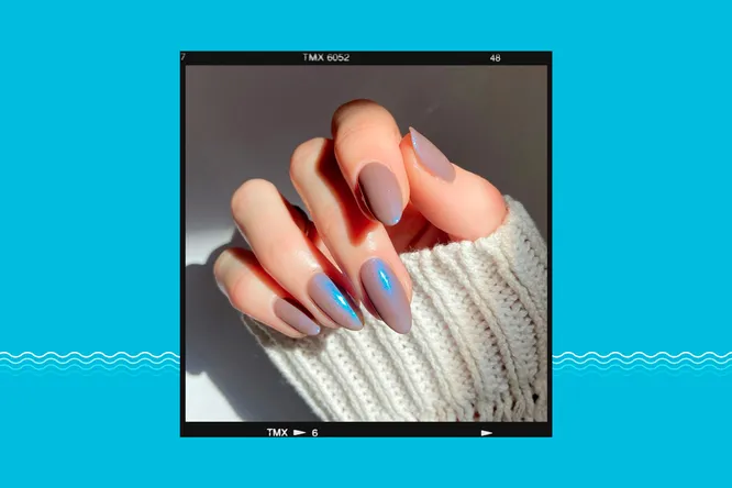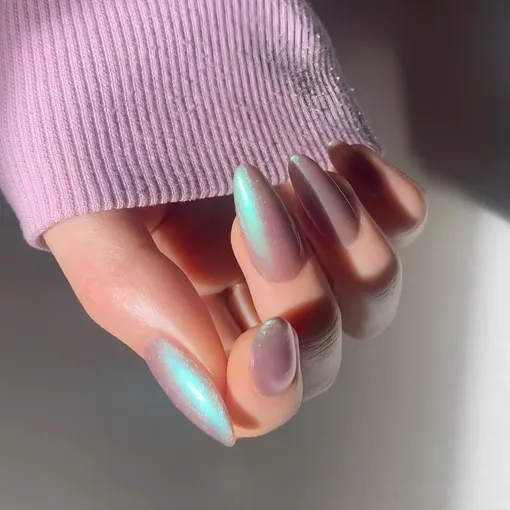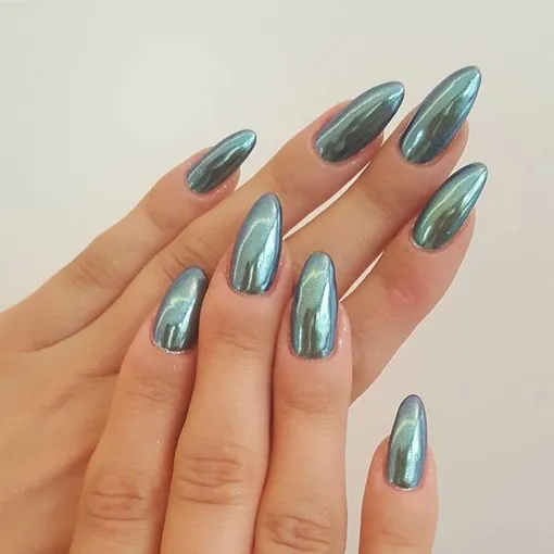 Синий хром прекрасно сочетается с коричневым оттенком серого или серым с розоватым подтоном. На длинных ногтях такой маникюр смотрится особенно элегантно.