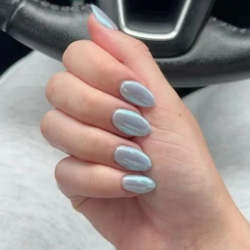 Этот серый маникюр с холодным, синеватым хромом, выглядит элегантно и очень по-зимнему. Такой оттенок очень здорово смотрится на бледной коже с нейтральным подтоном.