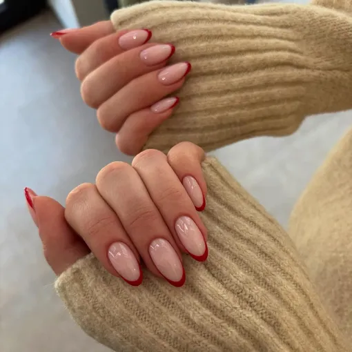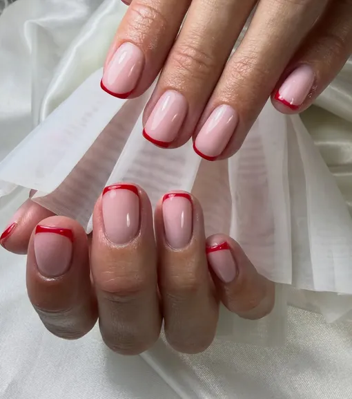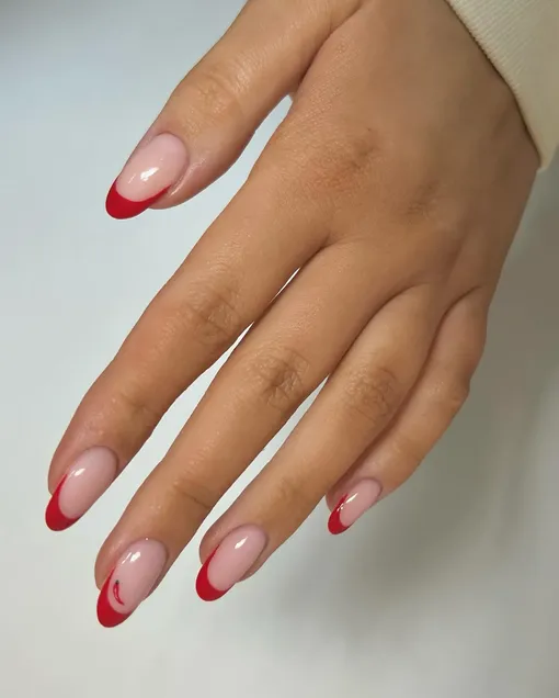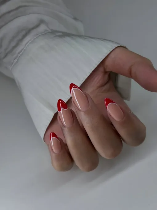 Красный френч на молочной основе идеально ляжет на невероятно женственную овальную форму ногтей.