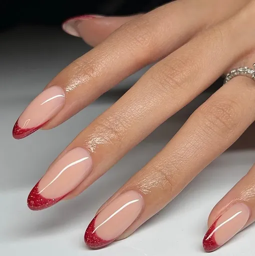 Красный френч будет выглядеть еще более празднично, если добавить на кончики немного сияющего глиттера.