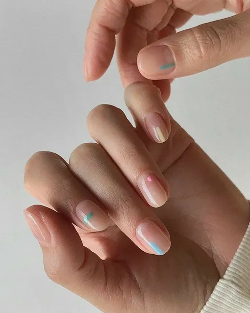Самый необычный способ контуринга ногтей — вот такой творческий дизайн с цветными штрихами. Преобладать должны именно вертикальные точки, но горизонталь и точки могут сделать его веселее и интереснее.