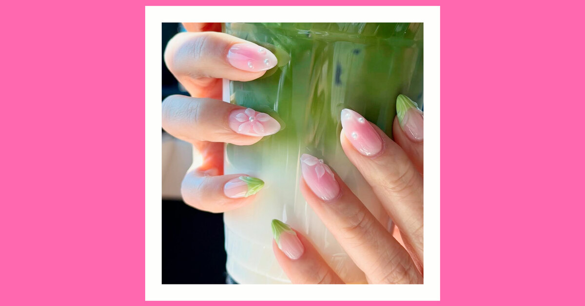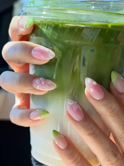 Цветочки весной? Ну просто бомба, особенно если они еще и с матчей! Попробуй 3D-маникюр (как на этом примере), с которым добавишь ногтям дополнительное измерение красоты.