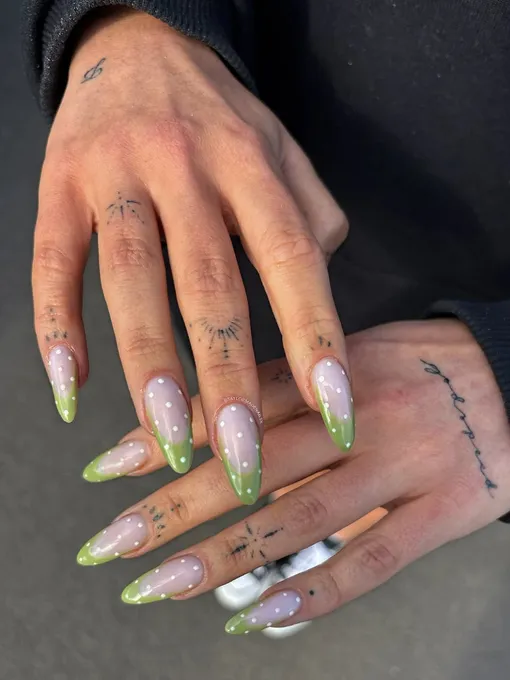 Ты прям фанат-фанат френча? С этой классикой тяжело расставаться, понимаю. Тогда ты можешь прокачать любимый дизайн, соединив два главных весенних тренда: матчу и горошек. В итоге получается милый маникюр с легкой искринкой.