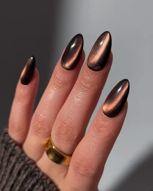 Маникюр выполнен в технике кошачий глаз или металлического покрытия, с глубоким бордовым оттенком, уходящим в медно-бронзовые переливы. Такая техника придает ногтям визуальный объем и подходит для вечерних образов. Отлично смотрится дизайн с кожаными аксессуарами и пальто.