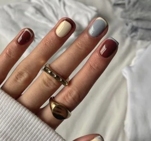Каждый ноготь окрашен в отдельный осенний оттенок: бордовый, кремовый, серо-голубой и терракотовый. На некоторых ногтях по свободному краю или по контуру добавлены тонкие линии в темно-бордовом тоне. Этот вариант может стать интересным экспериментом, который подойдет почти к любому образу.