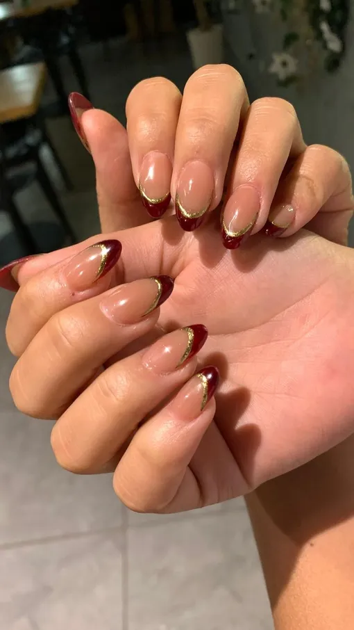 Такой дизайн сочетает классический френч с сезонным бордовым трендом. В основе лежит натуральный нюд с глянцевым финишем, а яркий френч декорирован золотой полоской. Выглядит роскошно, а если понравится, то ты вполне сможешь повторить данный маникюр уже в новогодний сезон.