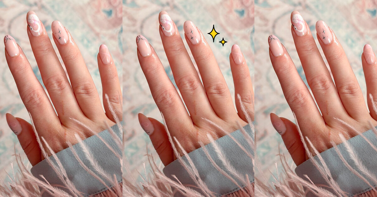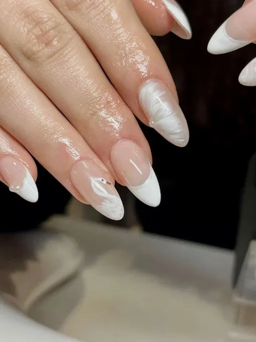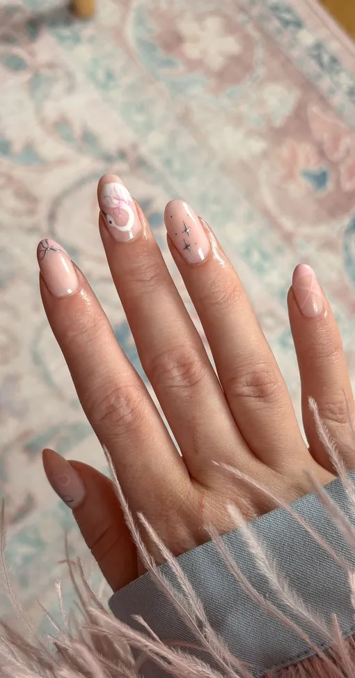 Минималистичная база здесь сочетается с тонкими рисунками и небольшими деталями — от изящных линий до едва заметных символов. Такой маникюр выглядит как украшение настоящей принцессы-лебедя.