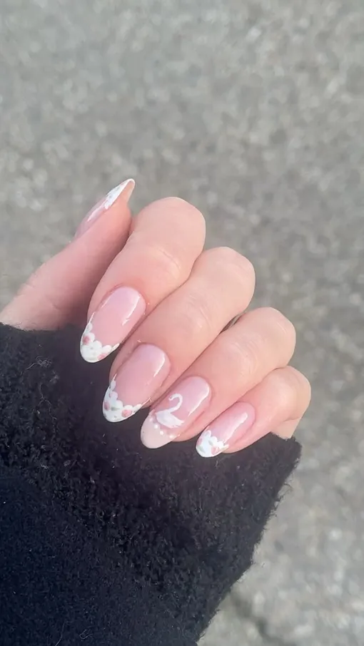Классический французский маникюр здесь дополнили маленькими цветами и аккуратным силуэтом лебедя. Получается нежный, почти весенний дизайн со сказочным настроением.