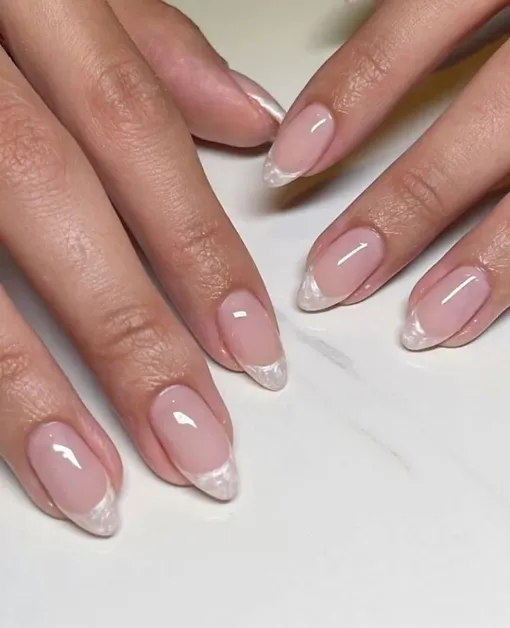 Кончики ногтей оформлены с легким сиянием и напоминают жемчуг, нарисованный перламутром. За счет этого френч выглядит более мягко и нежно, чем классический вариант.