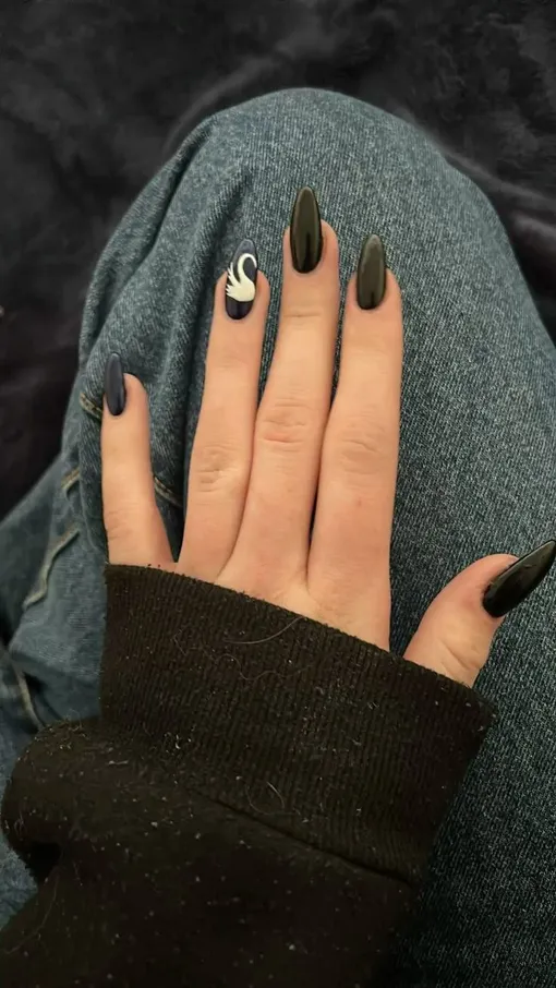 Контрастный дизайн с глубоким темным покрытием делает силуэт лебедя особенно выразительным. Здесь мы видим минимум деталей, но за счет цвета и формы маникюр выглядит драматично и цепляет взгляд.