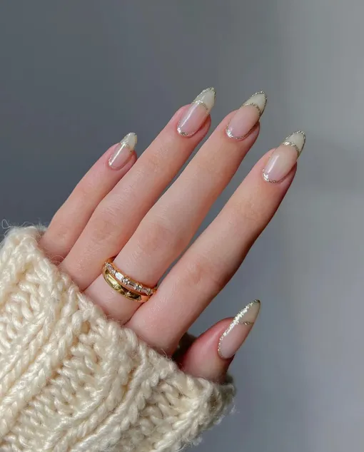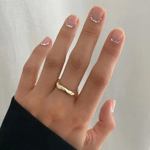 Здесь классический нюд превращается в арт-объект — благодаря едва заметным металлическим вкраплениям у кутикулы. Маникюр выглядит так, будто на ногтях рассыпаны крошечные зеркала. Он подойдет для тех, кто хочет подчеркнуть стиль и выделиться среди привычных вариантов. Такой дизайн легко подружится с серебряными украшениями, придавая всему образу особый, почти футуристичный шарм.