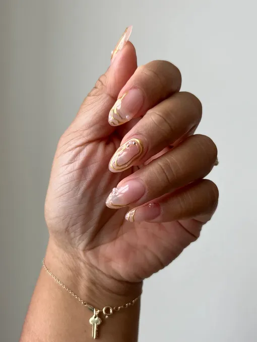 Прозрачная база с мягким розовым подтоном здесь украшена тонкими золотыми прожилками, которые имитируют узор мрамора. Дизайн прекрасно сочетается с золотыми украшениями и аксессуарами, добавляя образу тепла и блеска. Подходит для невест, которые ценят минимализм, но не отказываются от изящных акцентов.