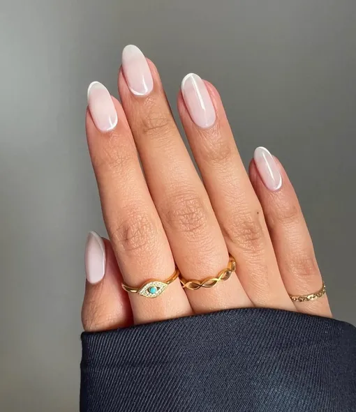 Градиент от розового к молочному с легким перламутровым сиянием создает эффект утренней дымки. Маникюр выглядит утонченно и универсально, подчеркивая естественную красоту ногтей. Такой вариант идеально вписывается в классическую свадебную эстетику, оставаясь элегантным и неброским.