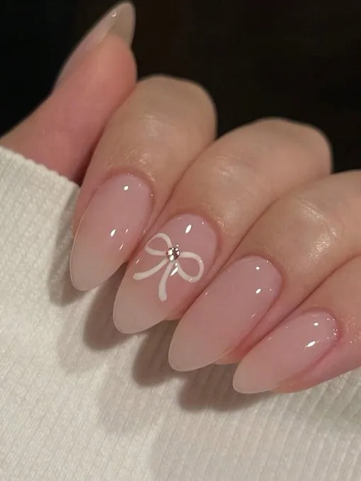 Нежно-розовая база и аккуратный белый бант с маленьким стразиком в центре создают по-настоящему романтичный образ. Такой дизайн подойдет невестам, которые хотят выглядеть сдержанно, но не против милоты. Он смотрится свежо и утонченно, а блеск топа усиливает эффект ухоженности. Идеальное решение для свадьбы в камерной, трогательной атмосфере.