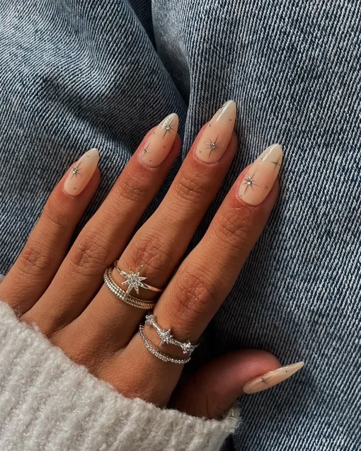 Нюдовая база здесь украшена миниатюрными серебристыми звездами, которые словно мерцают на кончиках ногтей. Этот вариант уместен для вечерней свадьбы или торжества в турецком стиле. Маникюр выглядит изысканно, но при этом современно, он добавляет легкого блеска и подчеркивает ювелирные украшения на руках. Такой дизайн оценят любительницы неброского, но эффектного акцента.