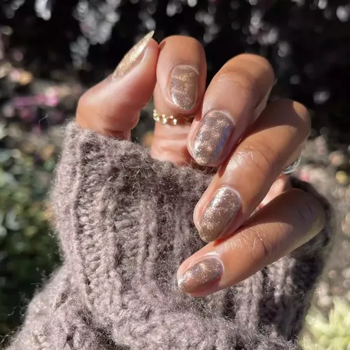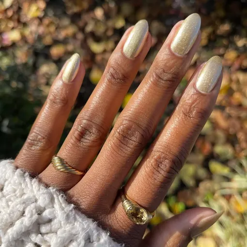 Металлический лак оттенка шампанского тоже может создать красивый нейтральный дизайн с бархатным эффектом. Чтобы результат выглядел аккуратно и профессионально, пройдись по кутикуле и краям ногтя скошенной кистью, смоченной в ацетоне, убирая лишний лак.