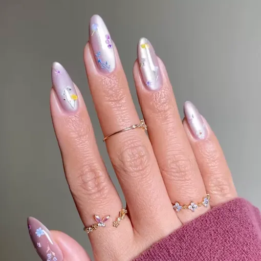 Какими бы эффектными ни были ногти с эффектом бархатного стекла сами по себе, снаклейками и рисунками они выглядят еще интереснее. Здесь мастер добавил цветочные наклейки, создав красивый эффект парящих в воздухе деталей.