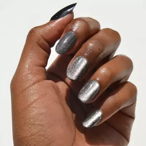 Добиться нейтрального маникюра с эффектом «кошачьего глаза» можно даже без базового нюдового покрытия. Просто нанеси на чистые ногти серебристый или золотой лак, создай рисунок с помощью магнита и закрепи топом. Результат — просто вау.