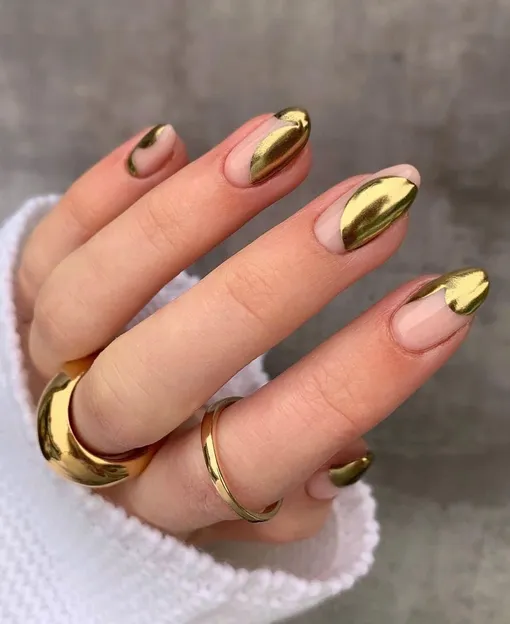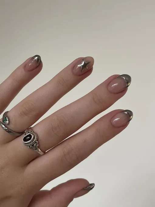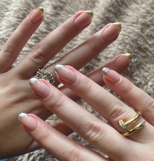 Чистый нюд с аккуратным золотым и серебряным френчем подойдет под любой образ и набор украшений. Хороший вариант для начала экспериментов с металлами!