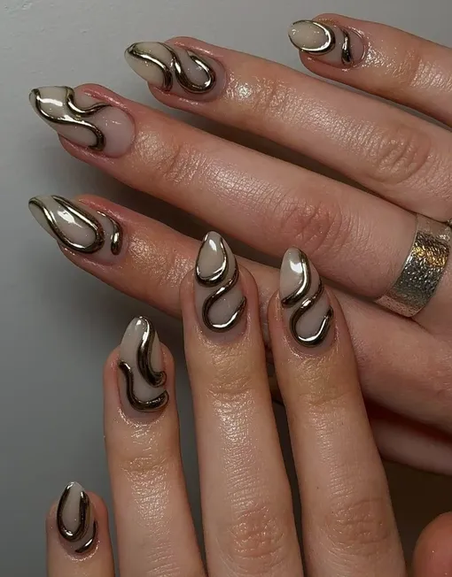 Объемные линии из хрома на нюдовой базе выглядят как диковинные змеи, охраняющие твой покой. Такой маникюр хочется рассматривать, ведь он так красиво играет со светом и движением руки.