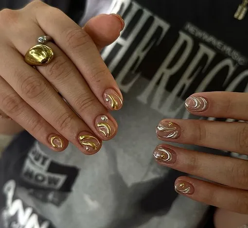 Мягкие золотые и серебряные акценты, будто нанесенные рукой свободного художника, создают эффект живого металла. Такой объемный дизайн будет смотреться красиво даже с минимальной длиной ногтя!