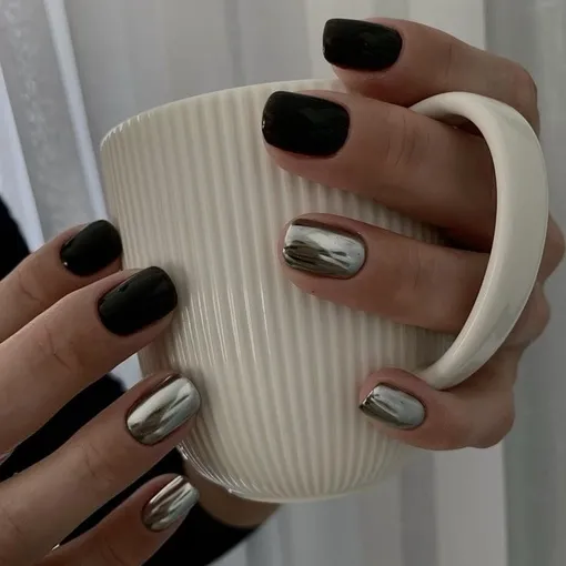 Глубокий черный лак в паре с зеркальными серебряными акцентами выглядит строго, но безумно красиво. Такой дизайн выглядит особенно эффектно с лаконичными нарядами и идеально подходит для вечерних образов в холодное время года.