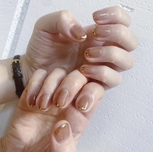 Минималистичный золотой френч с мягким округлым краем смотрится особенно изящно на коротких ногтях. С ним тебе не надо выбирать между сдержанностью и сиянием, между повседневностью и ощущением особого статуса.