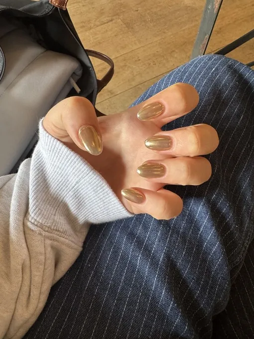 Зеркальное покрытие в оттенке светлого золота напоминает расплавленный металл, застывший на ногтях. Маникюр выглядит смело, но за счет чистого цвета и отсутствия декора не пошло, а очень даже повседневно и элегантно.