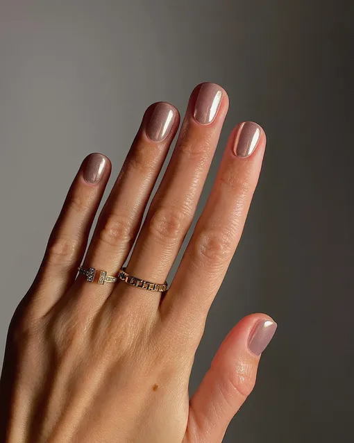 Нюдовое покрытие в сочетании с блеском хромированной втирки поможет создать маникюр, который добавит нотку элегантности в любой повседневный образ. Хочешь сделать дизайн еще более выразительным? Тогда используй в качестве основы лак цвета молочного шоколада и покрой его сверху глазурью в оттенке шампанского.