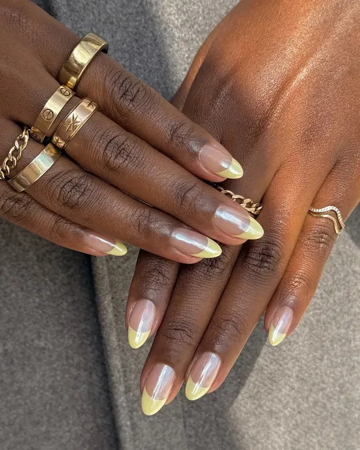 Осень ассоциируется у нас с самыми разными яркими красками, в том числе с цветом пожелтевшей листвы. Укрась кончики ногтей лаком в этом солнечном оттенке, а сверху добавь сияющую втирку, которая придаст маникюру волшебного блеска.