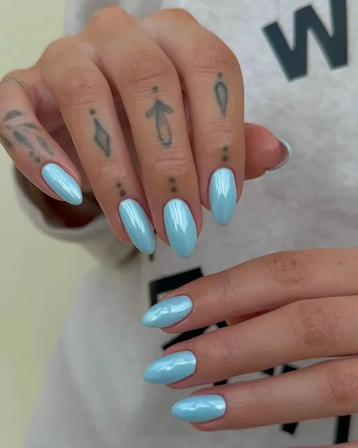 От этого сияющего маникюра в нежно-голубом оттенке как будто так и веет прохладой первых осенних заморозков. Ледяная глазурь на ногтях станет отличным решением для тех, кто с приходом осени не готов отказываться от ярких красок, но хочет максимально адаптировать их под новый сезон.