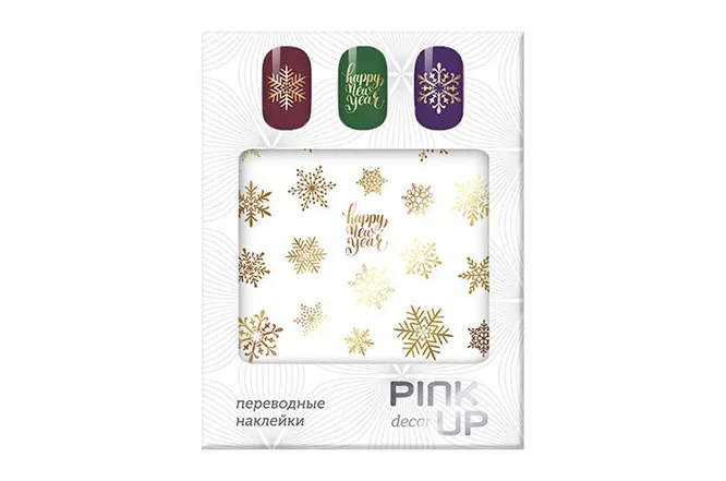 Еще один вариант наклеек в форме снежинок, только на этот раз в золотом цвете. Кстати, помимо прочего, в комплекте есть наклейки-надписи, которые также можно нанести на ноготь. Сочетай с яркими лаками, чтобы создать праздничный образ.