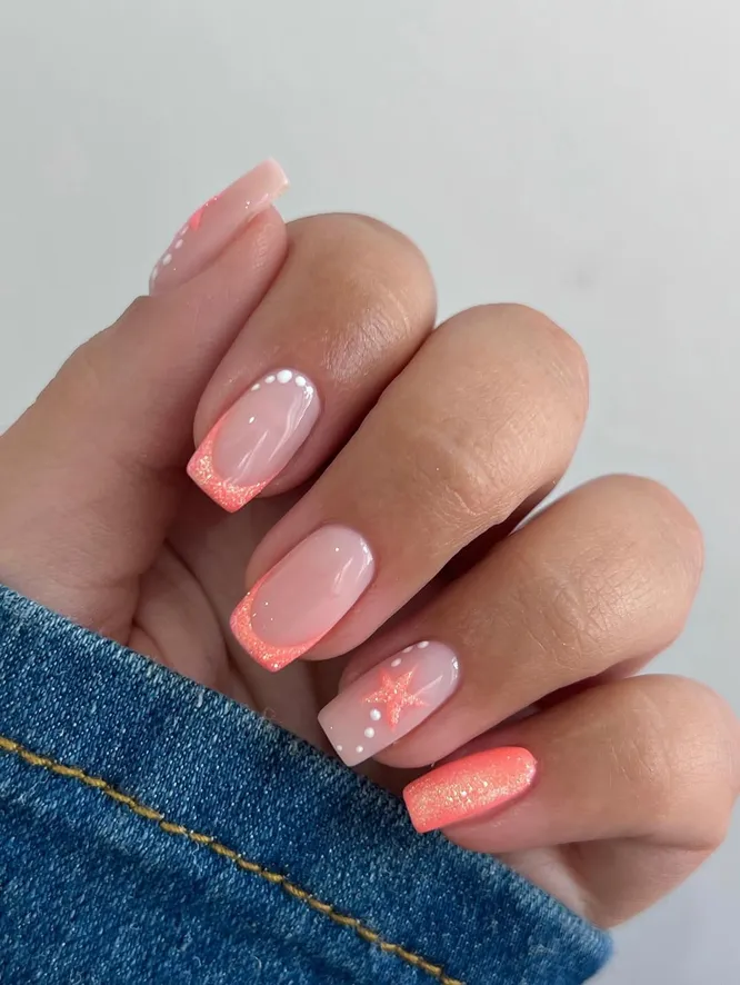 Коралловые кончики сами по себе очаровательны, но добавь немного блёсток, и ты получишь настоящий дофаминовый маникюр!
