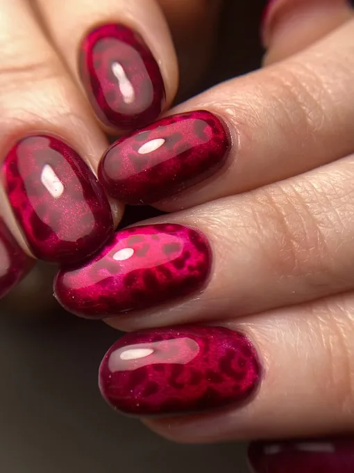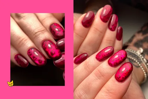 Любишь красный лак и леопардовый принт? Зачем выбирать что-то одно, если можно все гармонично сочетать в одном дизайне. Бордовые пятнышки на сверкащей рубиновой основе будут смотреться просто роскошно!