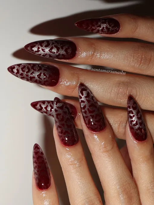 Леопардовый маникюр необязательно выполнять в традиционной бежево-коричневой гамме. В бордовых тонах хищные пятнышки также будут смотреться очень привлекательно.