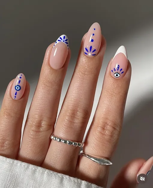 Предпоследний вариант у нас более игривый и графичный. Ярко-синие символы, напоминающие этнические узоры, выделяются на нюдовой базе. Особенно стильно выглядит глаз на безымянном пальце — этот элемент вносит в маникюр легкий мистический вайб.