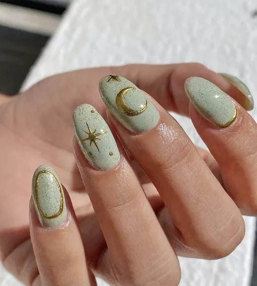 Здесь классика снова играет в необычном прочтении. Мятно-зеленый фон с легким крапом превращается в отличную базу для золотых рисунков луны и звезд. Цвет добавляет свежести и ощущение природы, а блестящие элементы создают баланс между земным и магическим.
